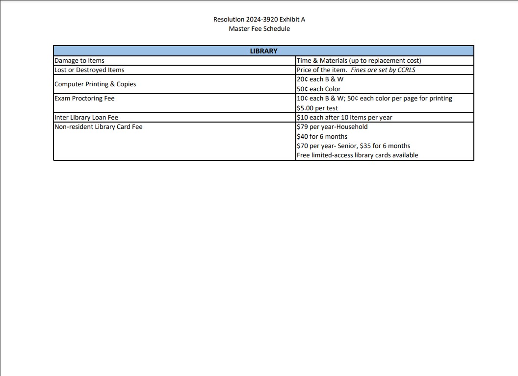 Below is a list of the fees associated with various library activities. Note that most items will renew automatically at the end of their checkout period, but NOT new items (with the new tape and date).